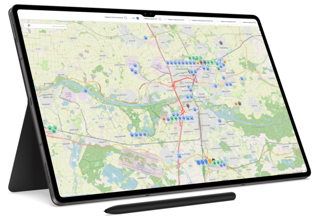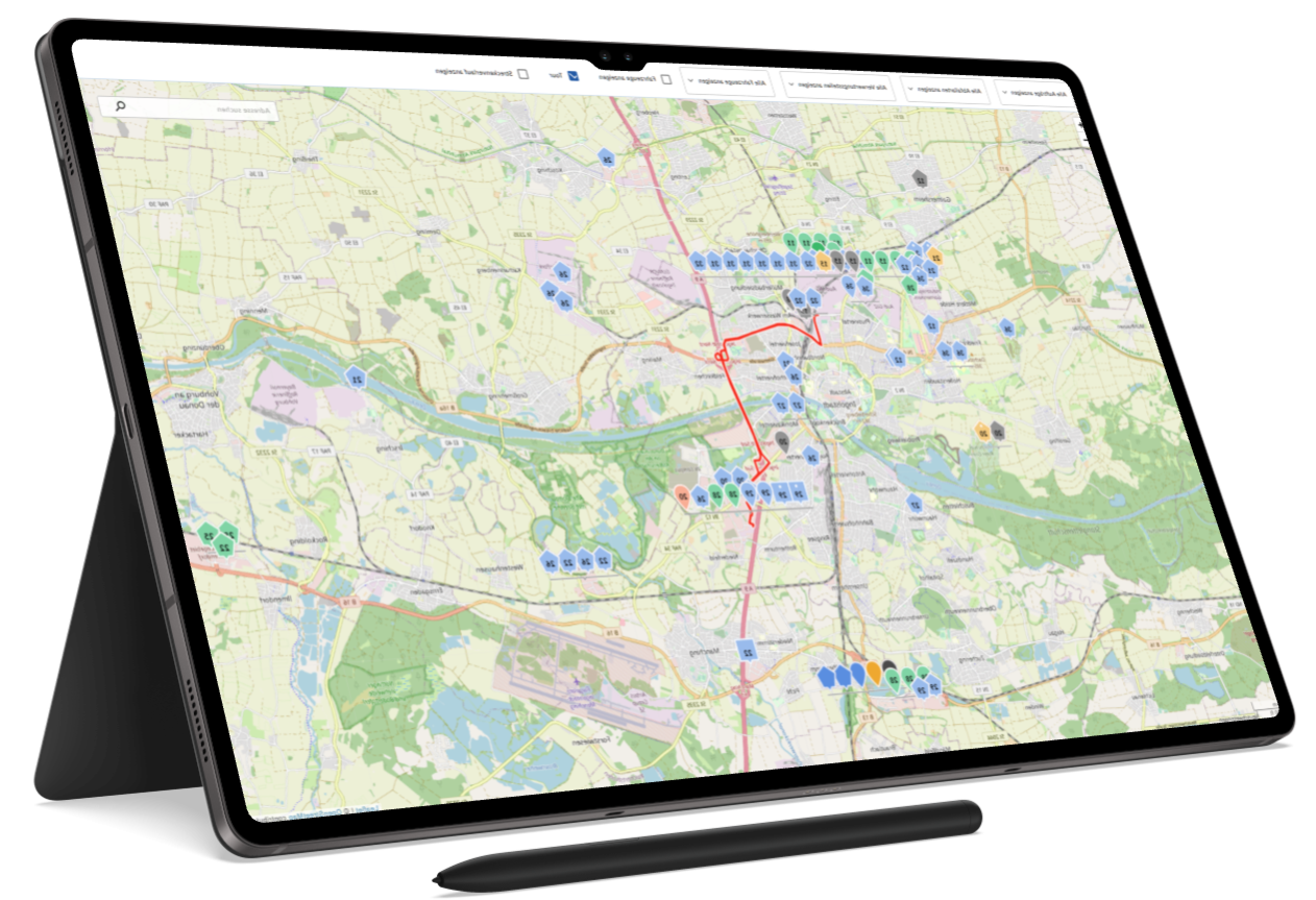 Die Routenplanung erfolgt intuitiv über eine interaktive Kartenansicht, in der Aufträge flexibel verschoben und optimiert werden können. Touren lassen sich direkt entlang der Strecke anpassen, wodurch Wegezeiten reduziert und Ressourcen effizient genutzt werden. Dank GPS-Tracking ist der aktuelle Standort jedes Fahrzeugs jederzeit nachvollziehbar. Das verwendete Kartenmaterial basiert auf OpenStreetMap und ermöglicht eine präzise Einsatzplanung in Echtzeit.